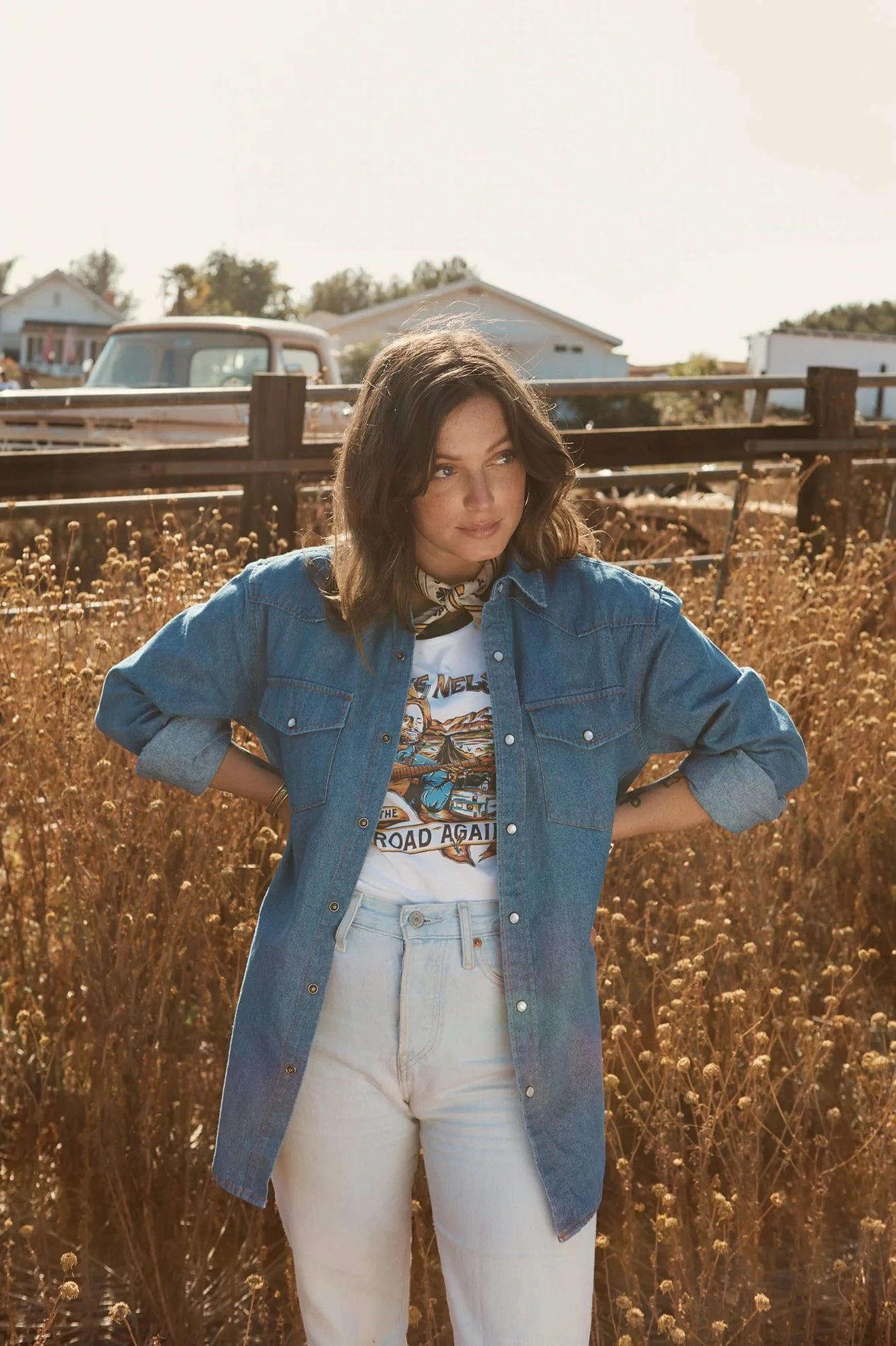 Essential Americana in a worn denim long-sleeve.