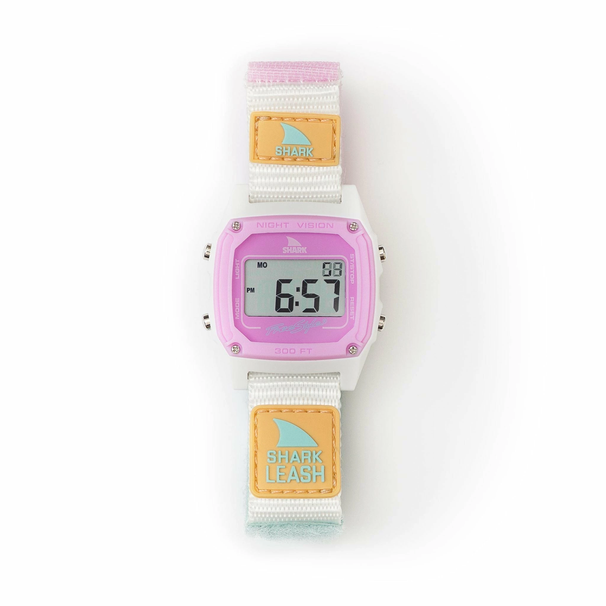 They’re Back. The original Velcro band that ignited Freestyle Watches in the late 80’s is back and better than ever. The shark leash’s velcro closure system is modeled after an 80’s style surfboard leash, and is ready to get radical. The Shark Leash comes loaded with standard digital features like time, date, stopwatch, countdown timer, alarm and night vision backlight. Like all Freestyle Watches, The Shark Leash is water resistant to 100 Meters and backed by our limited lifetime warranty. Shark to the Future!