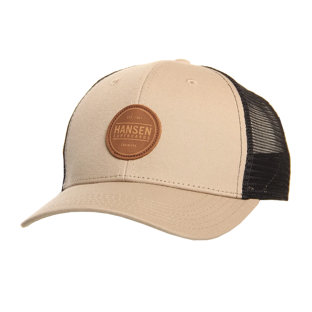 The Hansen Hat Box Patch Leather Trucker is a 65% cotton 35% Polyester snapback with leather patch at front.
