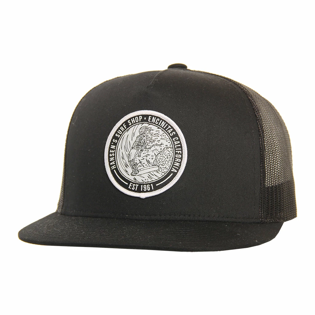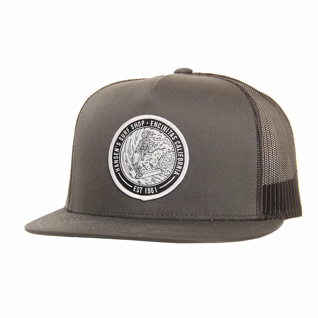 The Skeleton Surfer is a classic 5 panel mesh trucker hat. Featuring our Skeleton Surfer patch sewn on the front, and adjustable snap closure at the back.