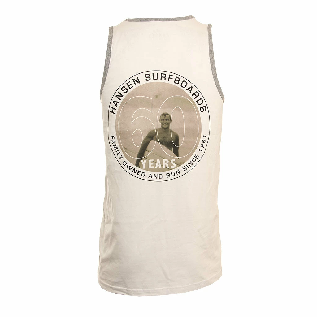 The Hansen Mens 60 Circle Tank Top is a 100% Cotton tank and features a front and back screen print. This is an iconic photo of Hansen Surfboards founder Don Hansen! Help us celebrate 60 yrs in business! 1961-2021