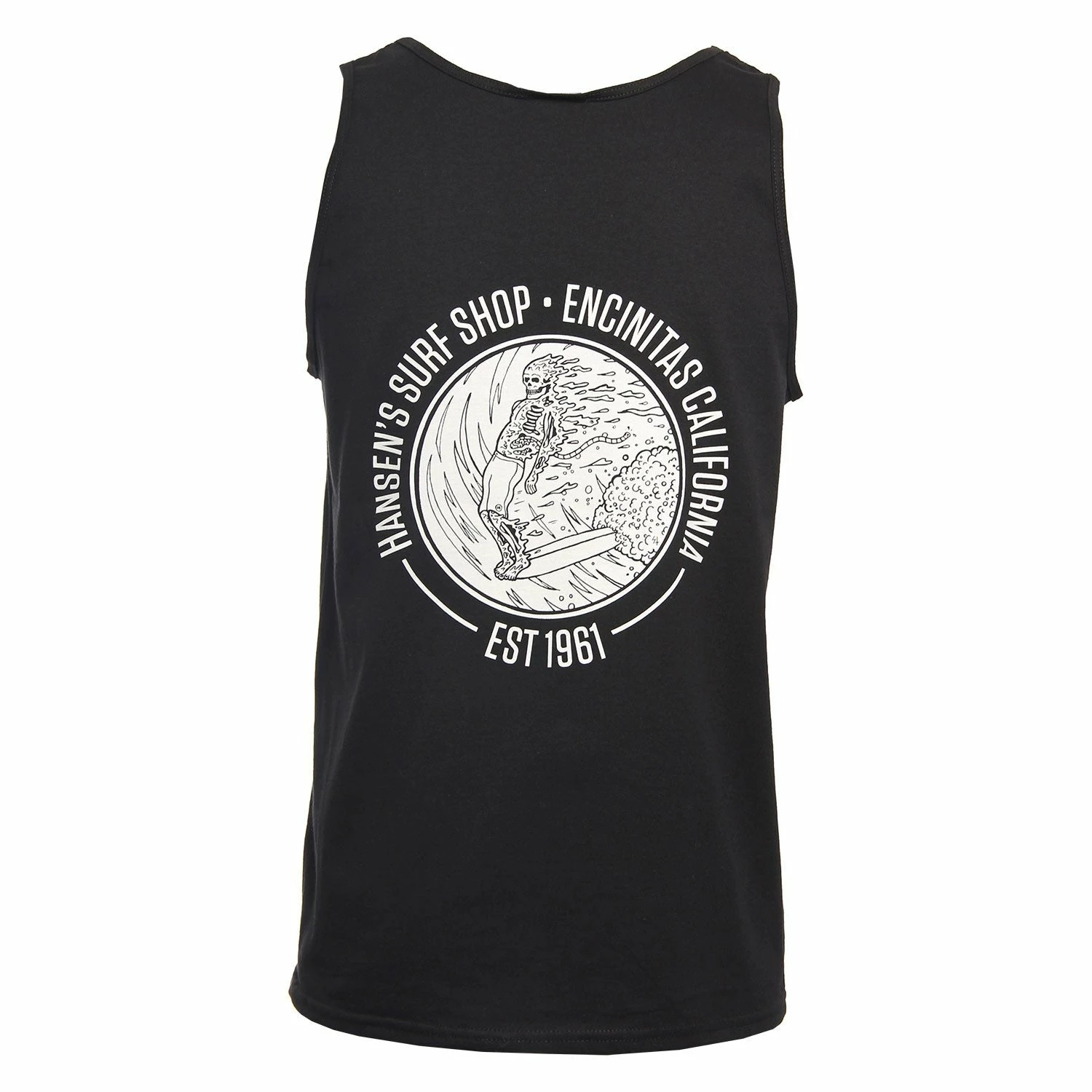 The Skeleton Surfer is a regular fit tank top with our original skeleton surfer logo. Made from 100% Cotton. This Design was done by Local Artist Sketchy Tank.Â