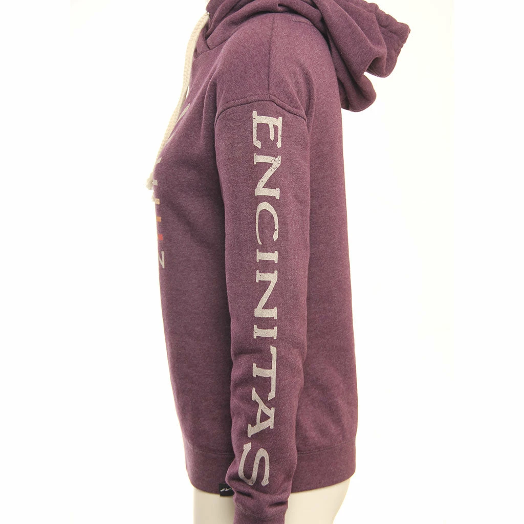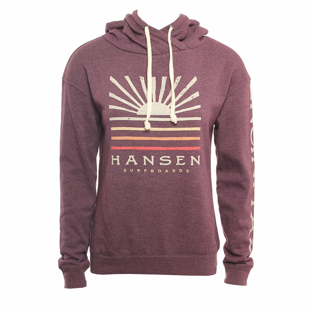 The Hansen Womens Sweatshirt Risin Sun Crossover Neck is a 52% Cotton 48% Polyester fleece hoody with front screen print and print on left sleeve.