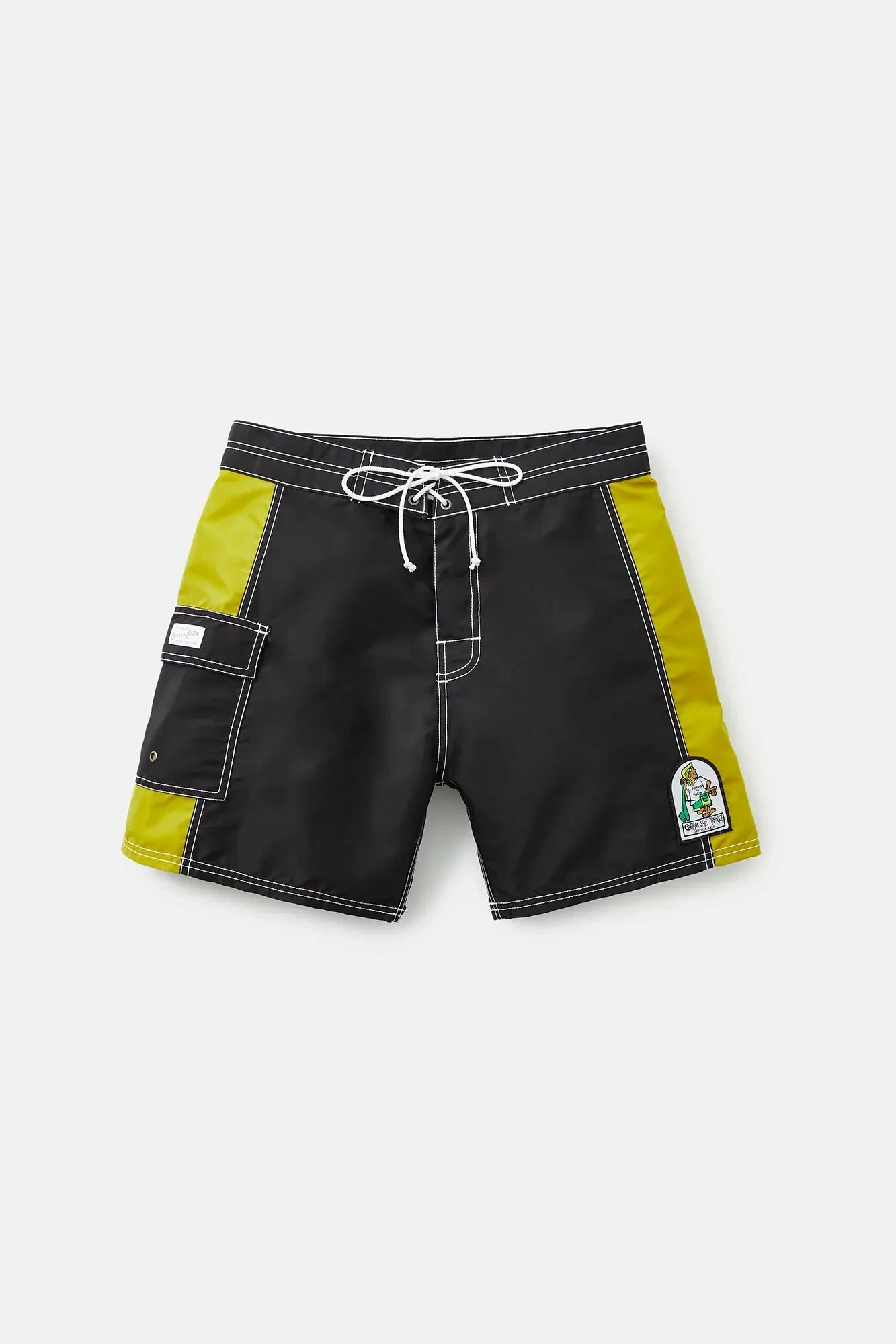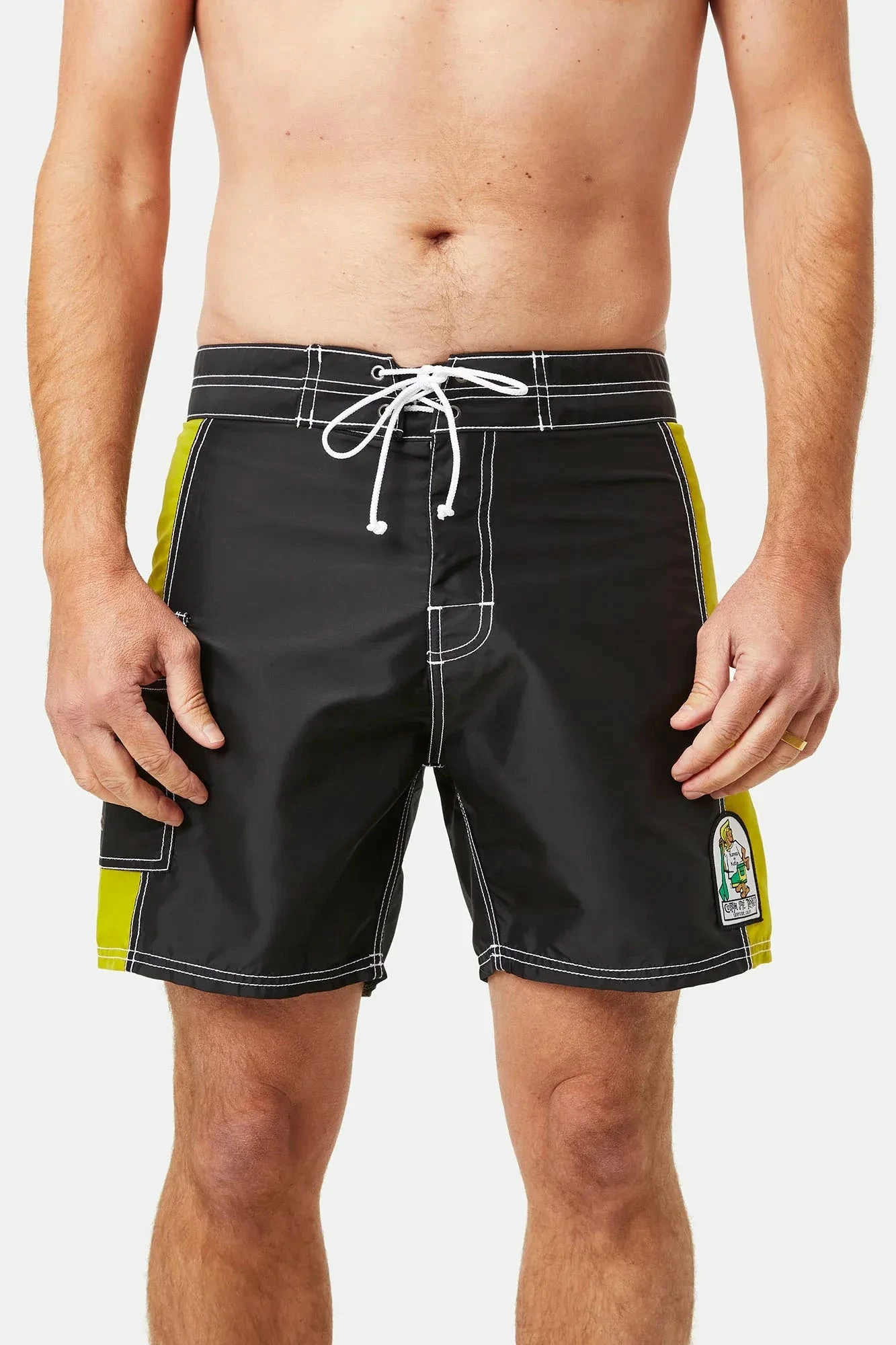 Part of the Heritage Collection, the Corky Trunk. Named after the great Corky Carroll, the first professional surfer, the Corky Trunk incorporates two contrast side panels, 17″ outseam and is made from a durable 100% nylon reversed flight satin. Just like the original surf trunks, this style features the same snap fly closure design and boat rope drawstring closure.