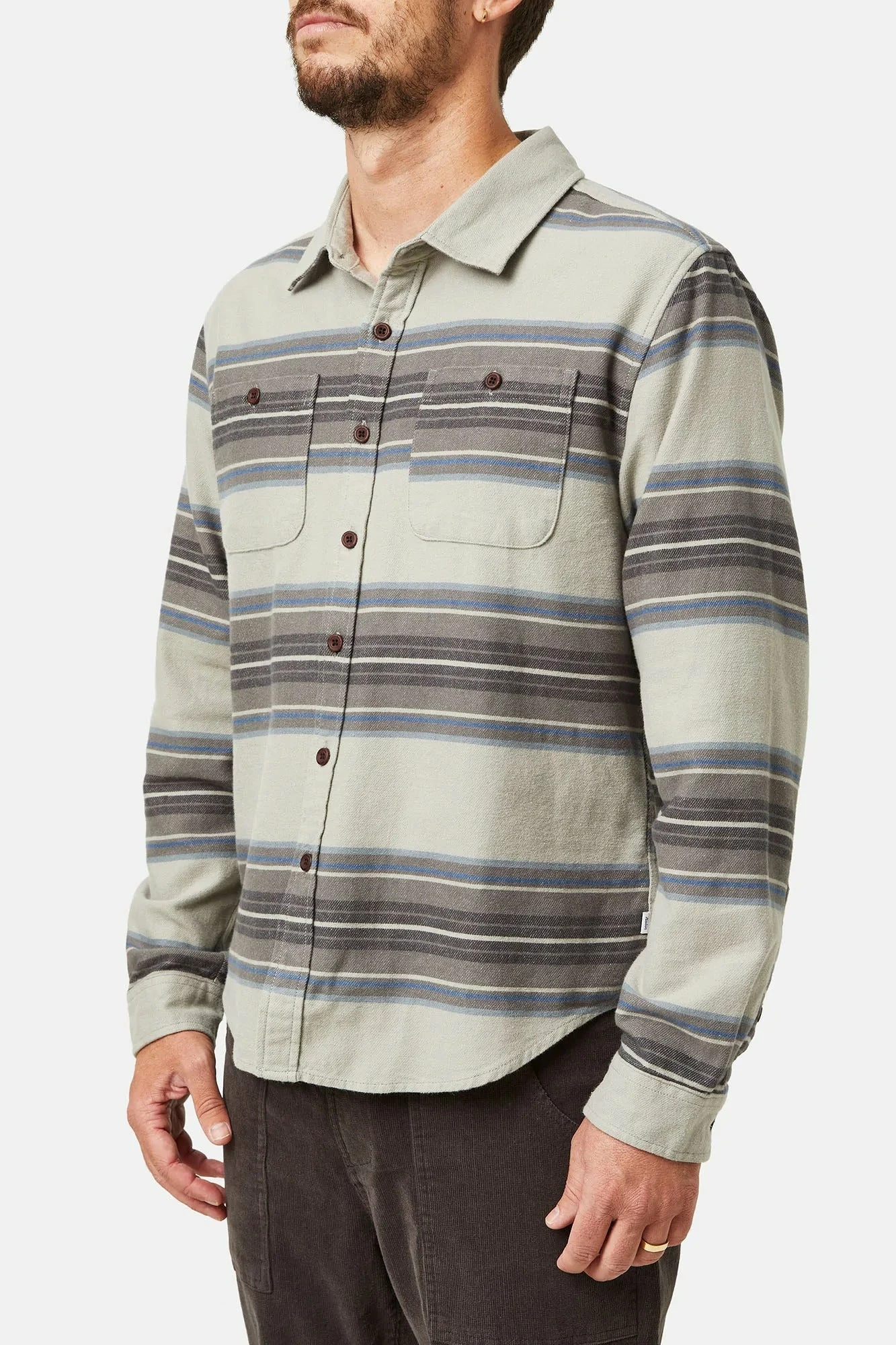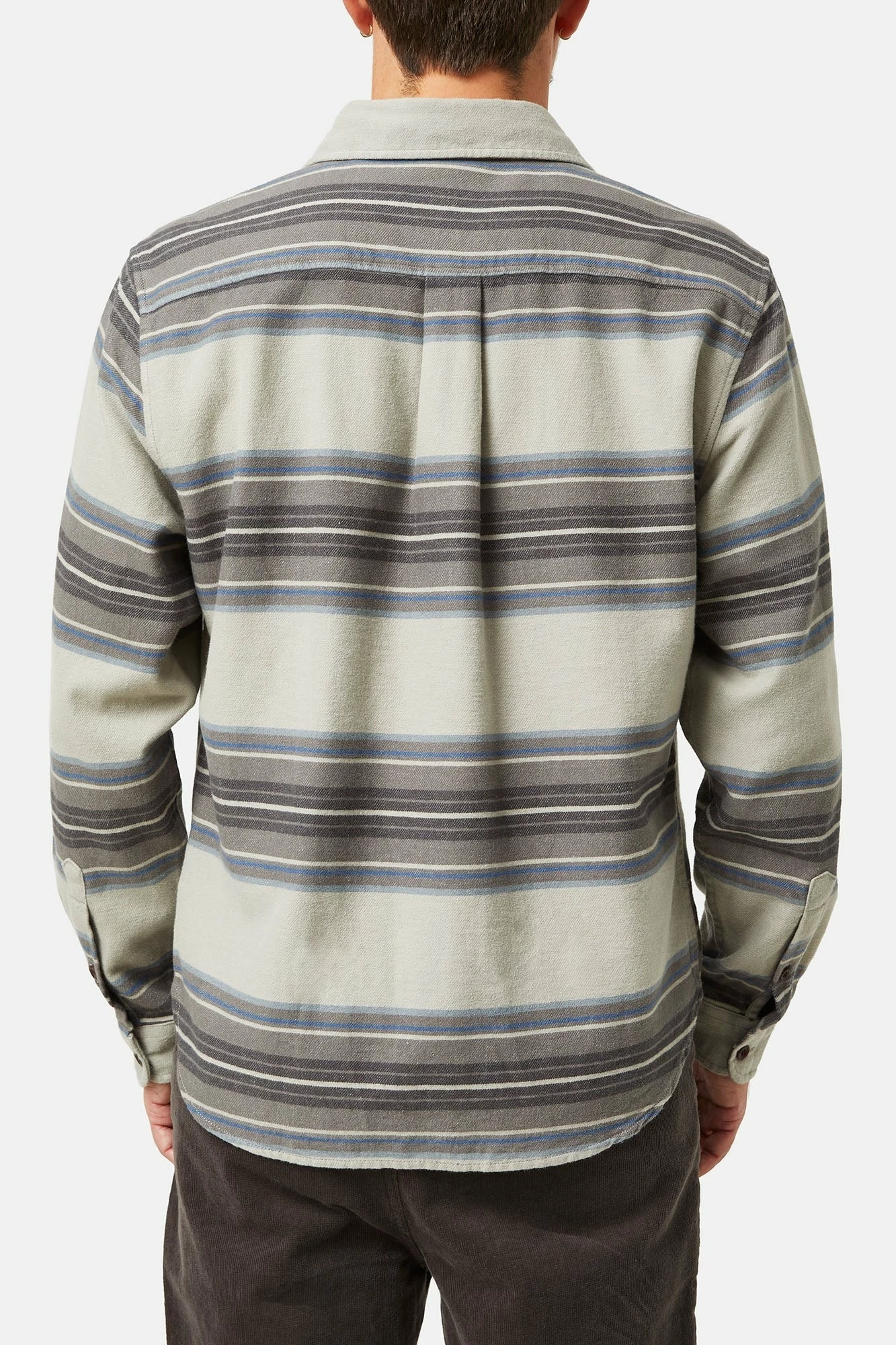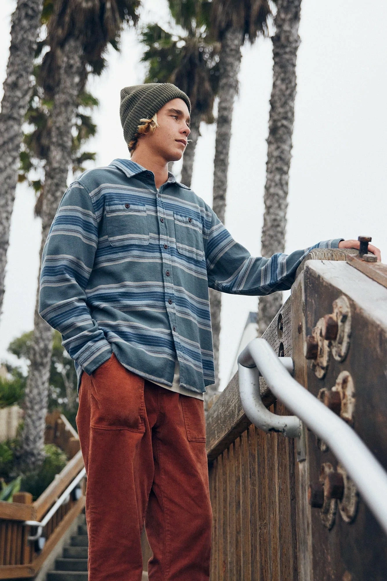 The Sierra Flannel a custom 100% cotton 4.8 oz twill weave stripe flannel featuring a diverse weight, brushed with an extra soft moleskin finish and washed with enzyme & softener.