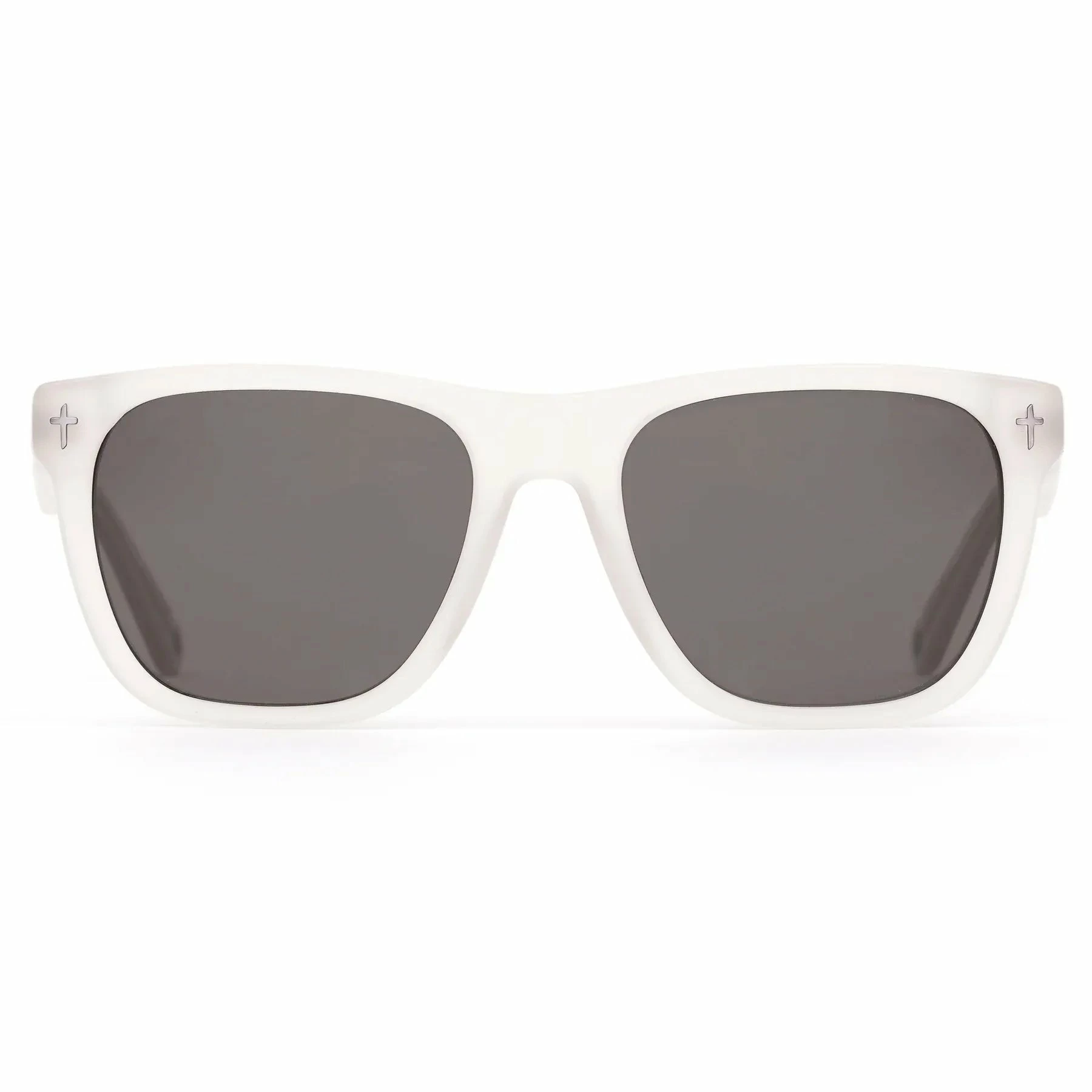 Stand out and roll on. This big frame covers all angles – from jeans and a tee to a suit, tie, and sneakers. This version of Panorama is made with frosted white frames, grey polarized lenses, and other key accents. Temple detailing features Jamie’s signature matte black cross.