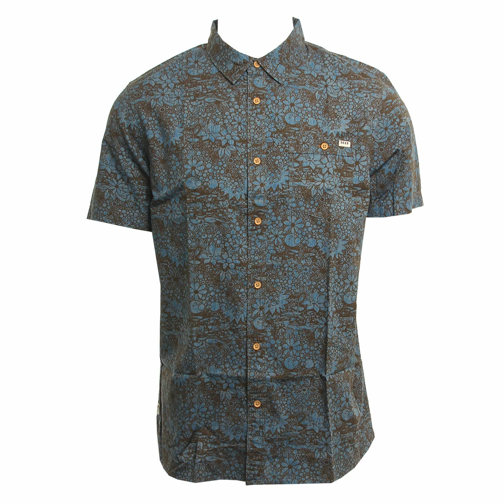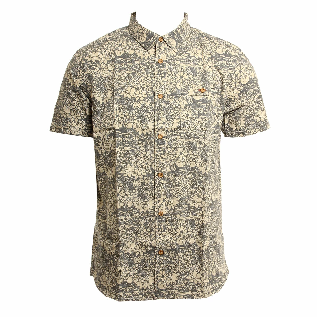 The Reef Garden is an all over reverse print woven with a garment wash for extra softness. Grossgrain details at interior neck. Chest pocket with button closure, scalloped hem at side seam, hanger loop at back yoke, faux wood buttons and woven labels. Made from a 100% cotton.