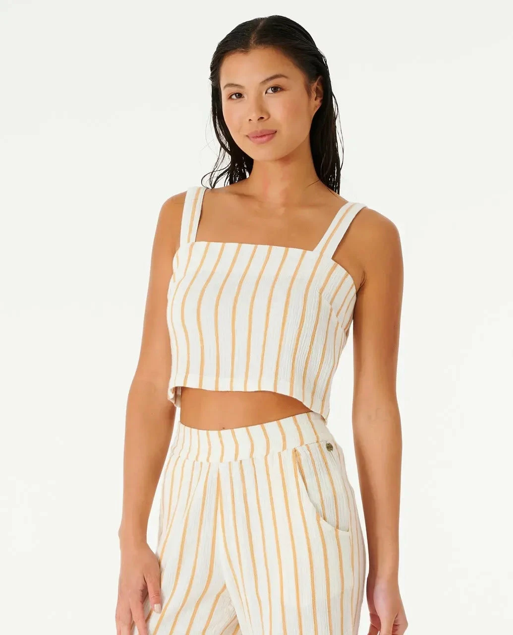 The Premium Surf Stripe Top is an epic women’s basic. Made from 100% cotton in a fitted cropped design, with a modern square neck, and textured and soft garment feel with yarn dye stripes and subtle smocking details.